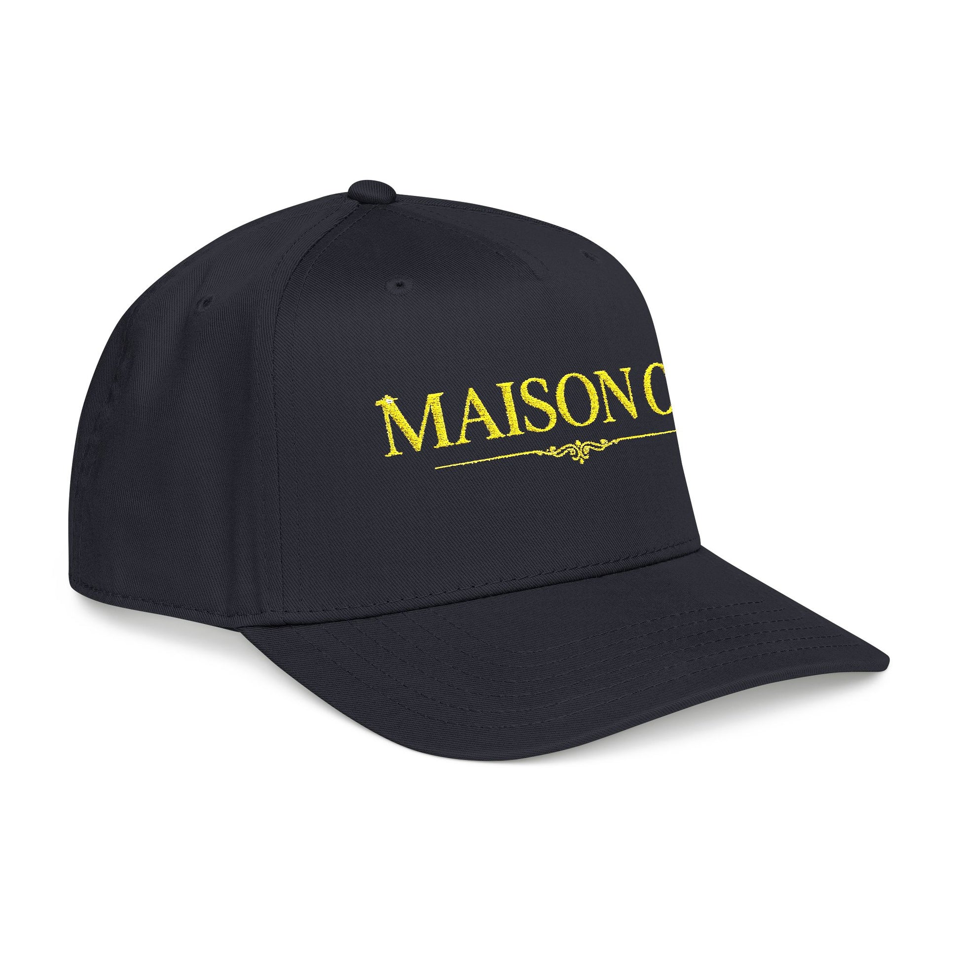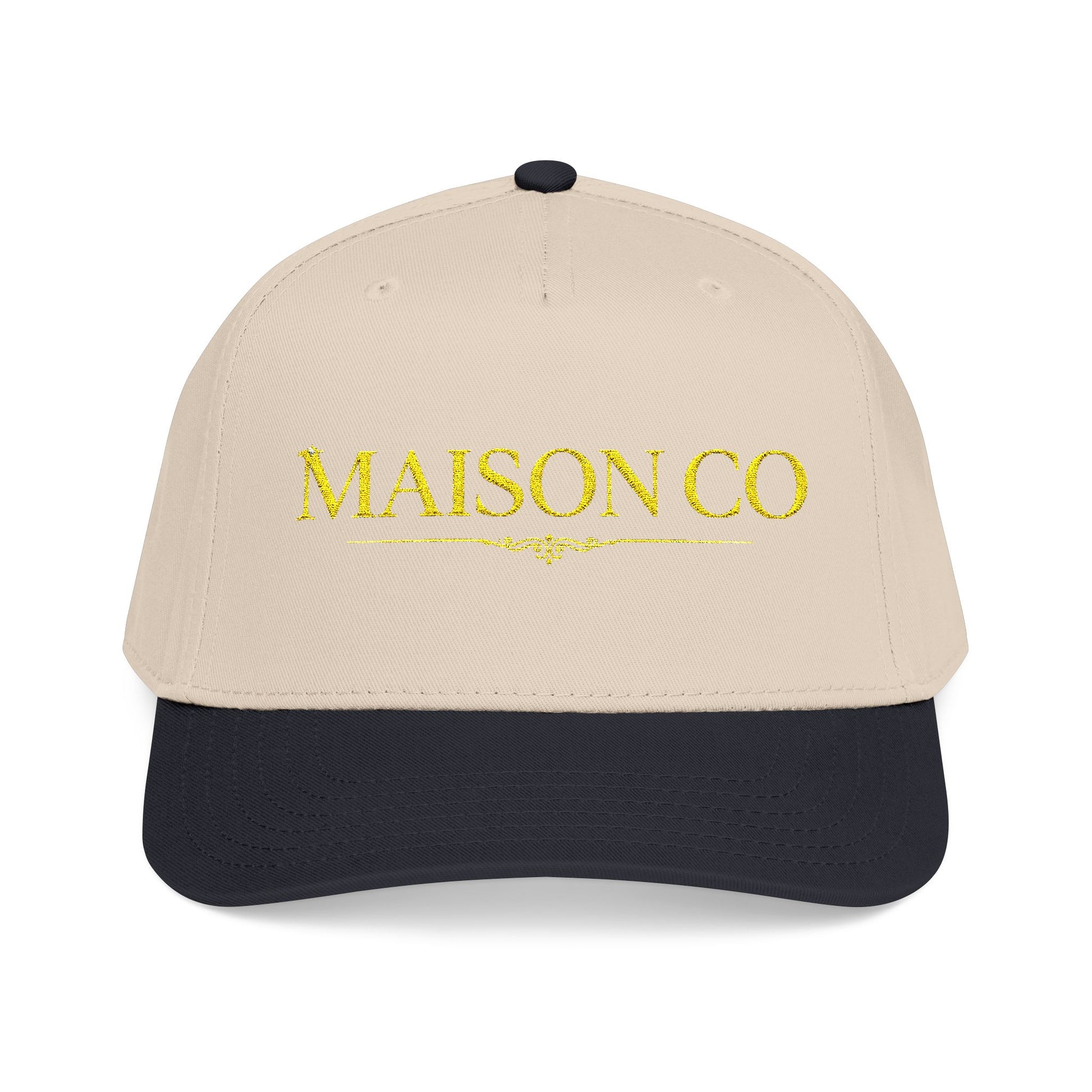 A refined mid-profile cap that blends clean structure with a touch of vintage charm. The neutral cream crown and deep visor creates a calm, grounded palette while the embroidered gold lettering adds quiet elegance. It sits comfortably above the brow with a seamless front panel for a smooth, polished look. Lightweight yet sturdy, this cap walks easily from weekend market runs to slow afternoon walks, adding a subtle statement without shouting. It feels like a familiar companion—simple, wearable, and quietly curated for those who appreciate small, thoughtful details.