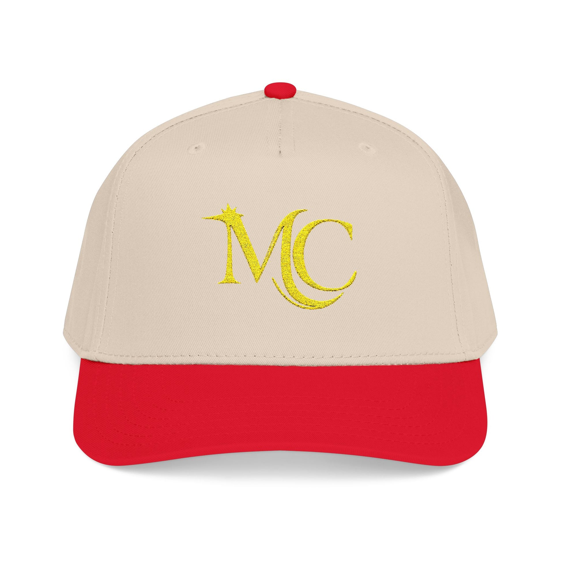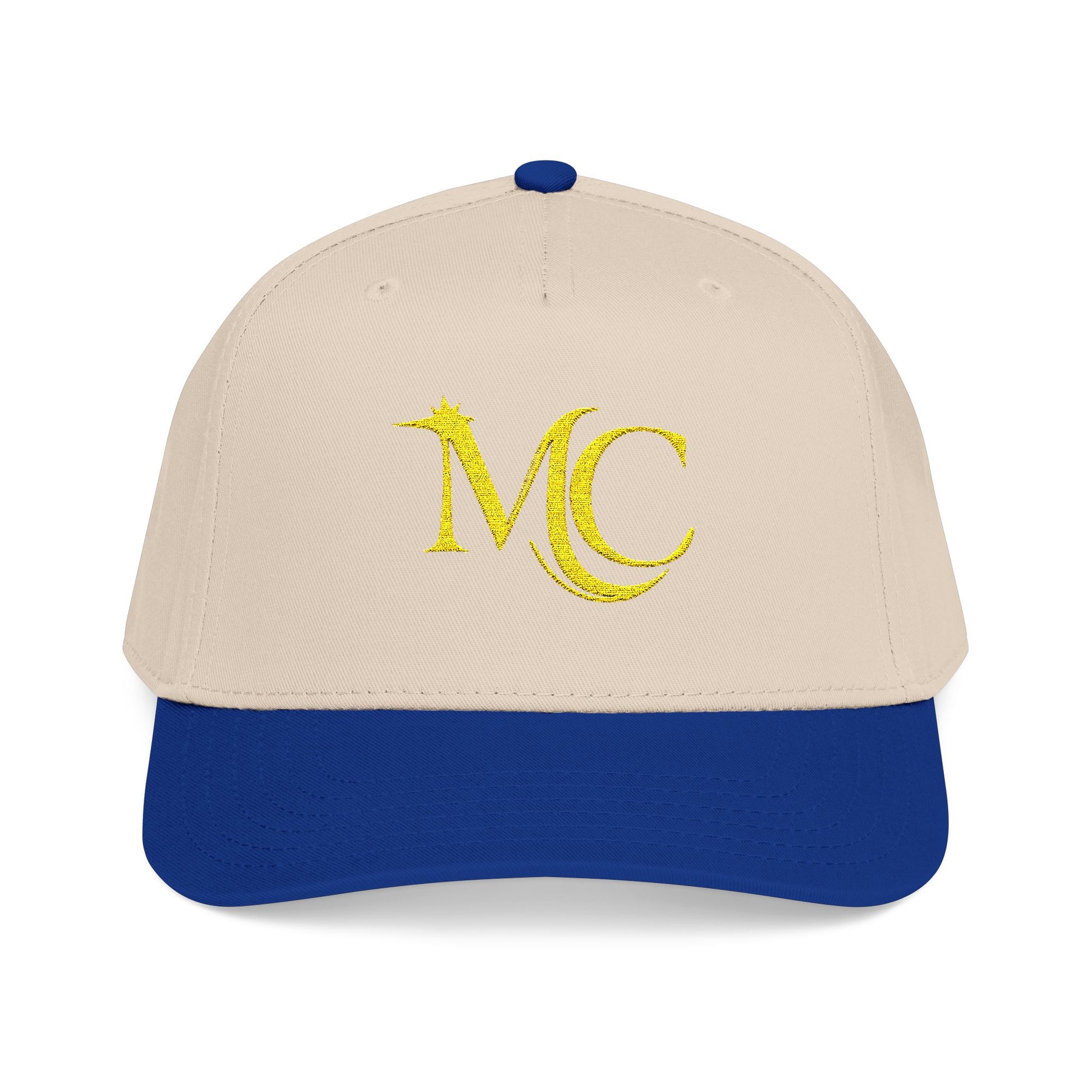 A low-key, mid-profile baseball cap that feels like a quiet nod to effortless style. The soft beige crown and deep forest brim create a grounded, vintage-inspired palette that slips into everyday wear. A textured golden "MC" emblem sits subtly on the front, catching light without shouting. Structured five-panel construction and a seamless front give the cap a clean silhouette that holds its shape. Wear it on slow mornings, lake runs, or while running errands—the understated colorway and crisp embroidery make it an easy layering piece for someone who prefers refined, lived-in looks.